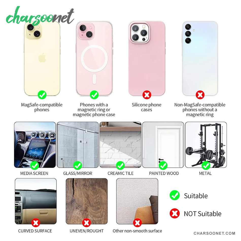 گوشی را به قسمت مگنتی نزدیک کنید. آهنرباهای داخلی فوراً گوشی را جذب و در مرکز نگه میدارند. طراحی مغناطیسی بهگونهای است که: