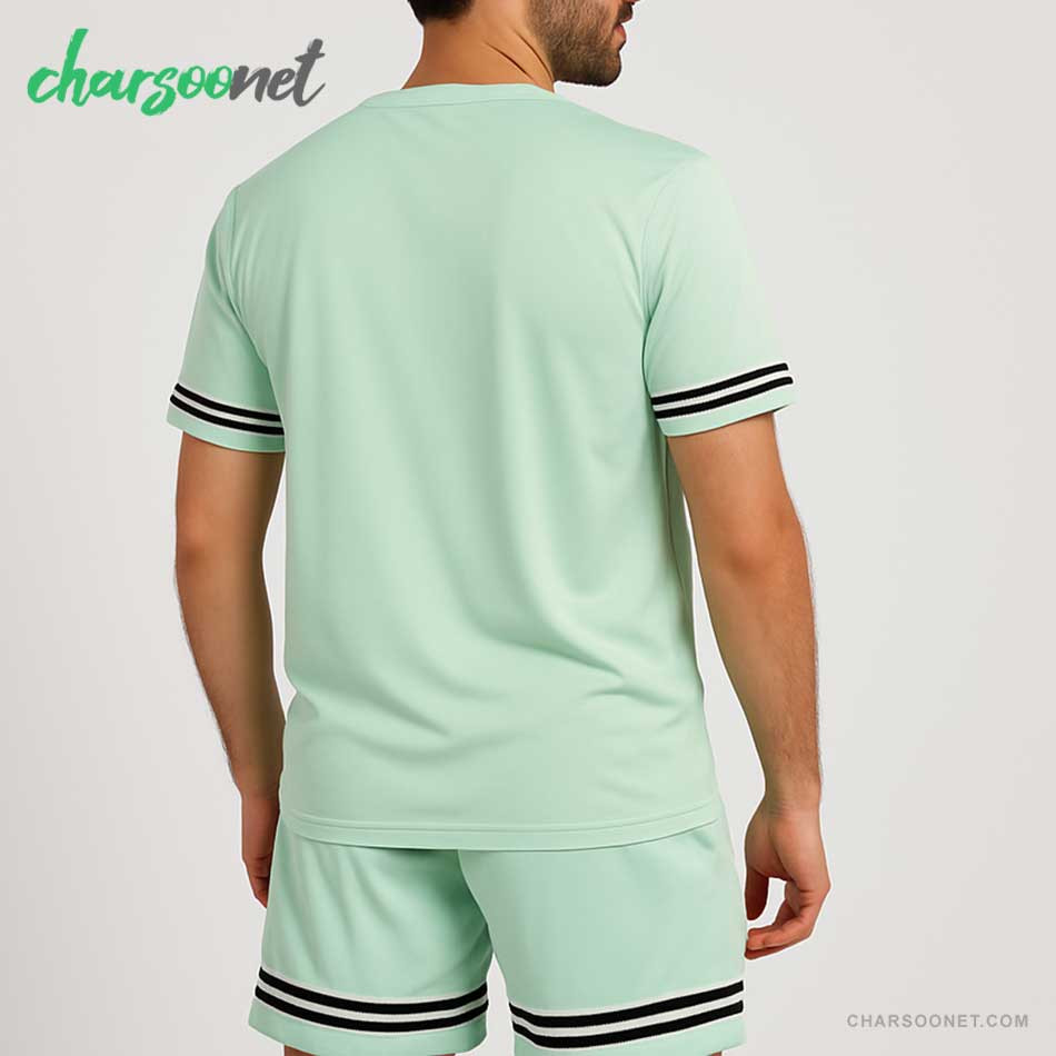 • رنگ:سبز با حاشیه‌های مشکی در سرآستین‌ها و پایین شورت، که ظاهری کلاسیک و حرفه‌ای دارد.