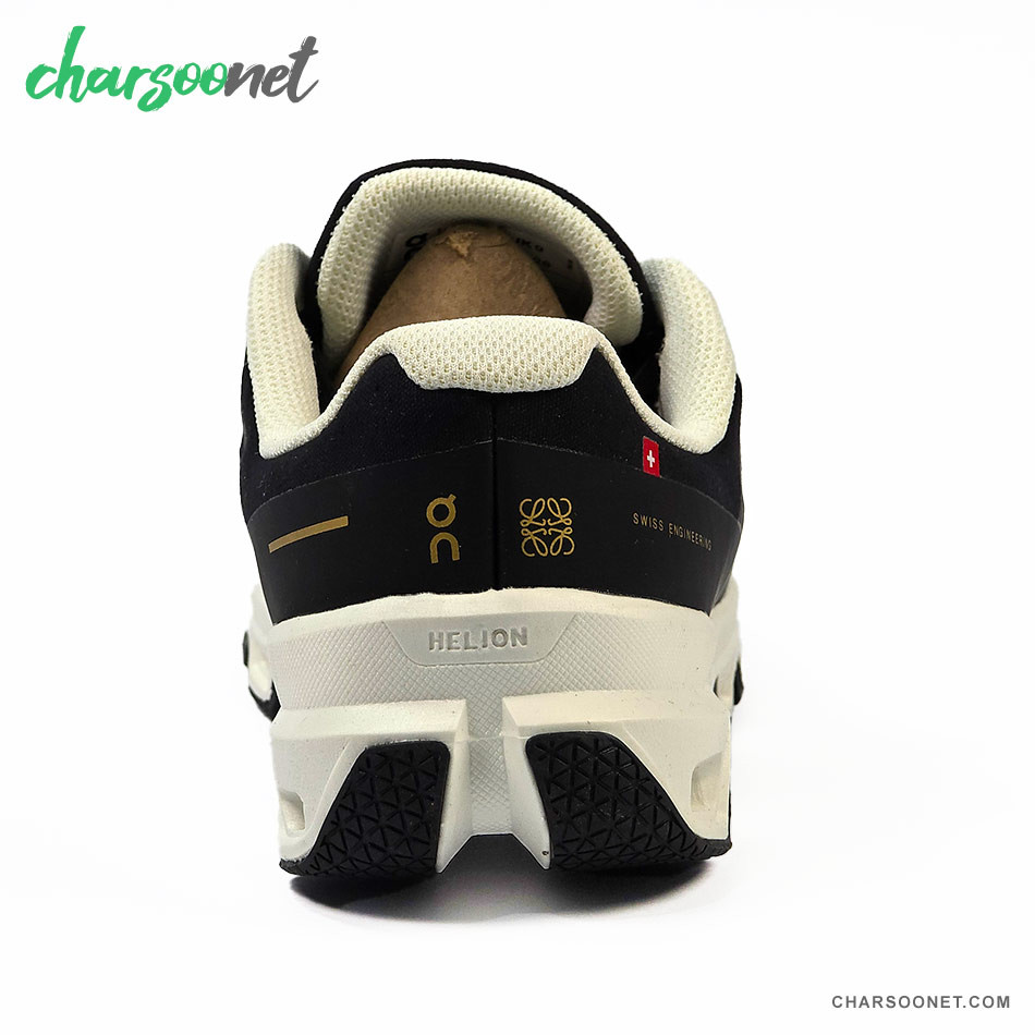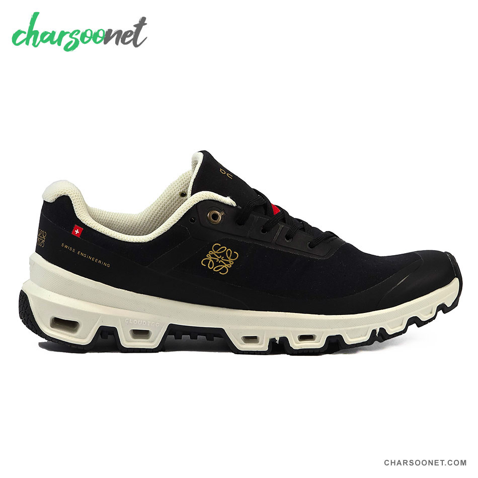 این کفش دقیقاً نتیجه همکاری خاص برند سوئیسی On Running با خانه مد لوکس اسپانیایی Loewe (از گروه LVMH) است. مدل پایه آن On Cloudventure (کفش تریل رانینگ حرفه‌ای) است که Loewe آن را کاملاً بازطراحی کرده: لوگوی طلایی Anagram روی بدنه و زبان، رنگ‌بندی مشکی مات با زیره کرم-سفید، جزئیات قرمز روی بند و پرچم کوچک پرچم سوئیس. نتیجه یک کفش تریل/روزمره فوق‌العاده شیک شده که هم در جنگل و کوه کار می‌کند و هم زیر شلوار کت‌وشلوار یا اورکت بلند لوکس به نظر می‌رسد.