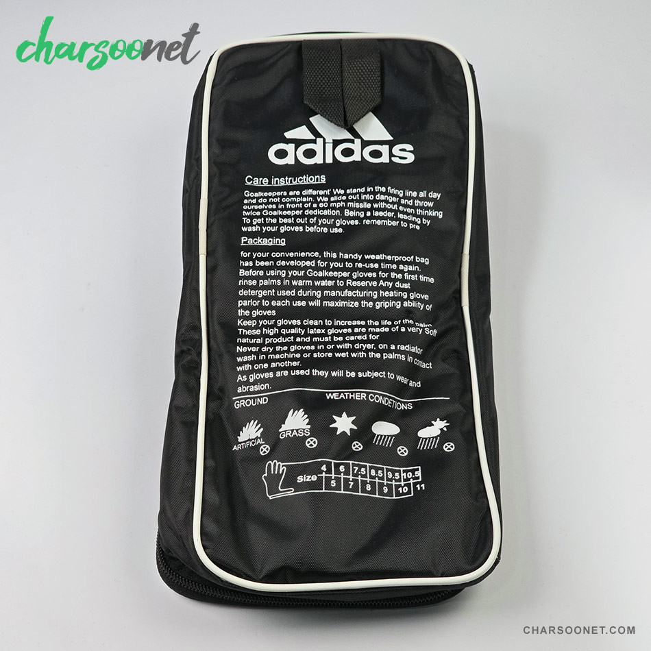 - کف دست لاتکس حرفهای: مجهز به لاتکس باکیفیت با بافت سهبعدی، چسبندگی عالی در شرایط مرطوب و خشک ارائه میدهد. لوگوی آدیداس نشاندهنده اصالت و دوام است.