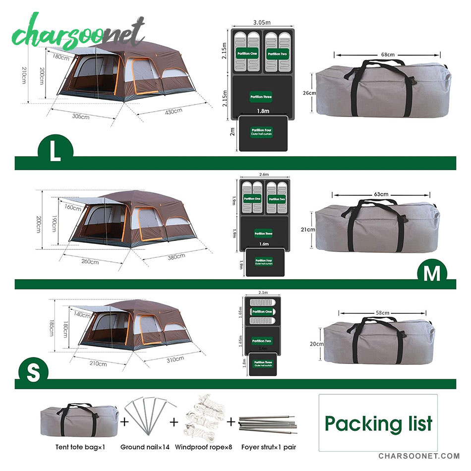 • ابعاد بزرگ و جادار: با طول 430 سانتی‌متر، عرض 305 سانتی‌متر و ارتفاع 205 سانتی‌متر، این چادر ظرفیت مناسبی برای 8 تا 10 نفر فراهم می‌کند و امکان استراحت راحت و قرار دادن وسایل شخصی را دارد.