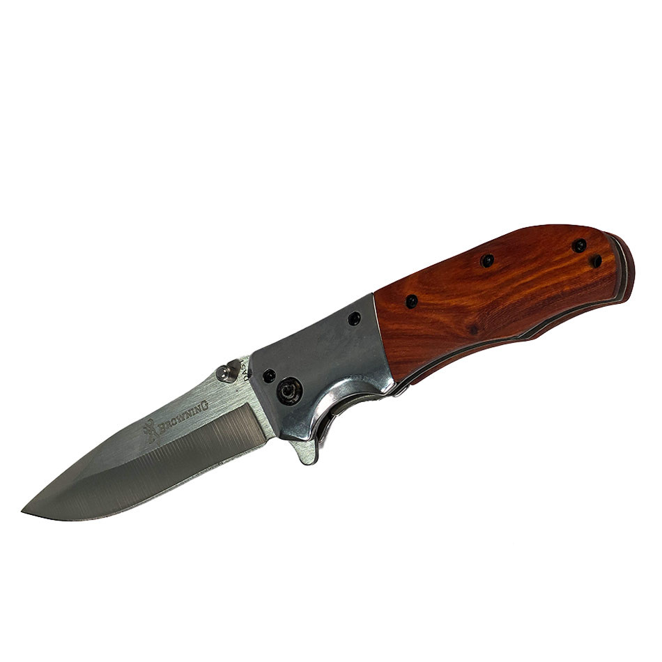 • رنگ و طراحی: تیغه نقره‌ای براق با لوگوی براونینگ، دسته چوبی قهوه‌ای گرم، مناسب سبک کلاسیک و شکار