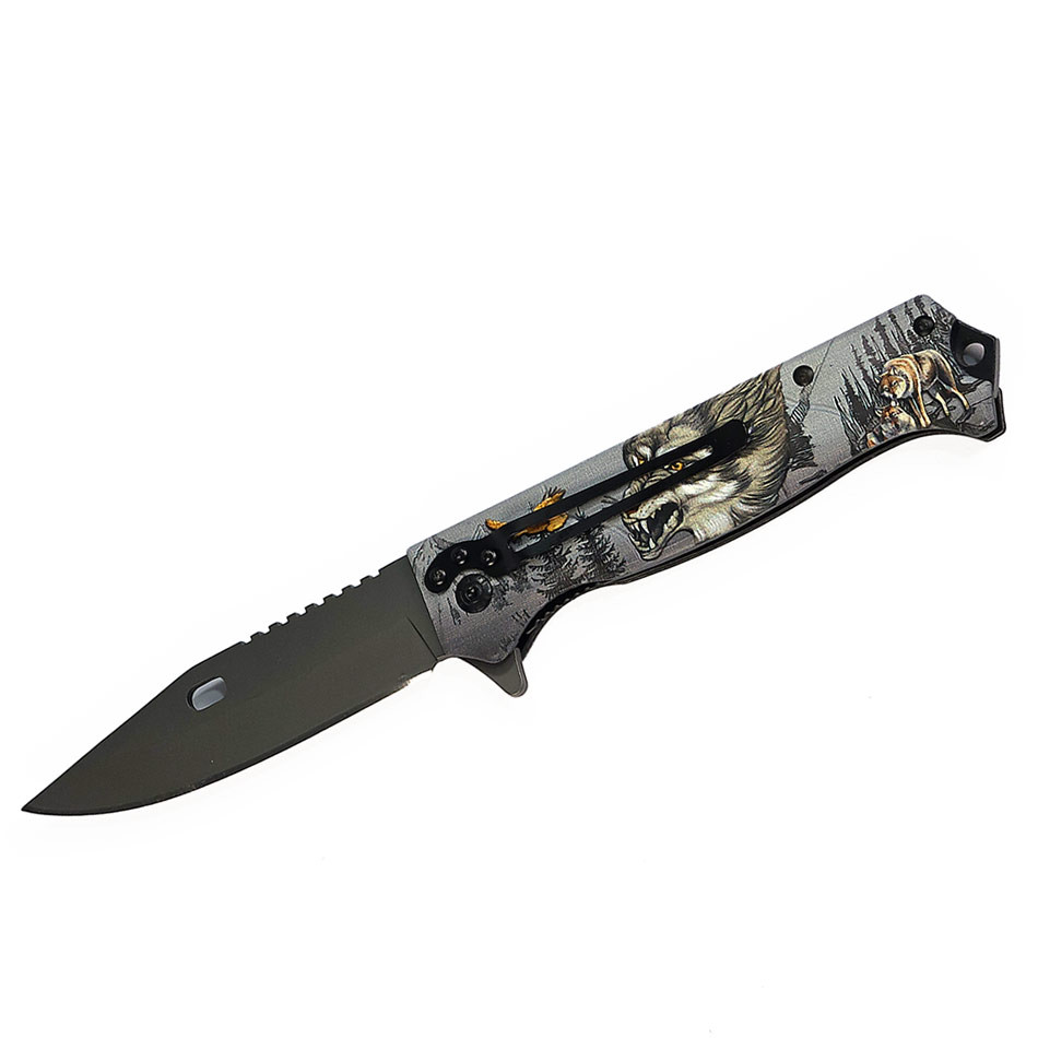 • رنگ و طراحی: تیغه مشکی مات با لوگوی براونینگ، دسته با طرح گرگ و جنگل، مناسب سبک وحشی و تاکتیکال